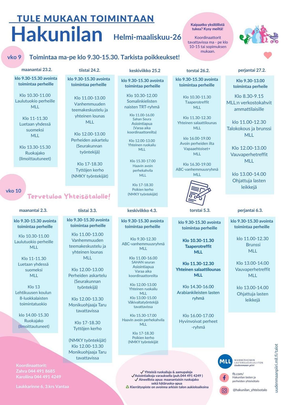Lapsiperheiden avoin kohtaamispaikka on avoinna arkisin klo 9.30-15.30. Tervetuloa vapaasti leikkimään ja oleilemaan yhdessä lapsesi kanssa