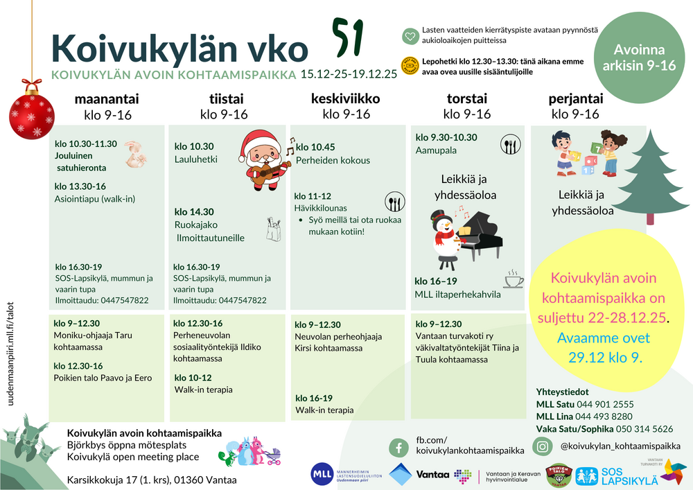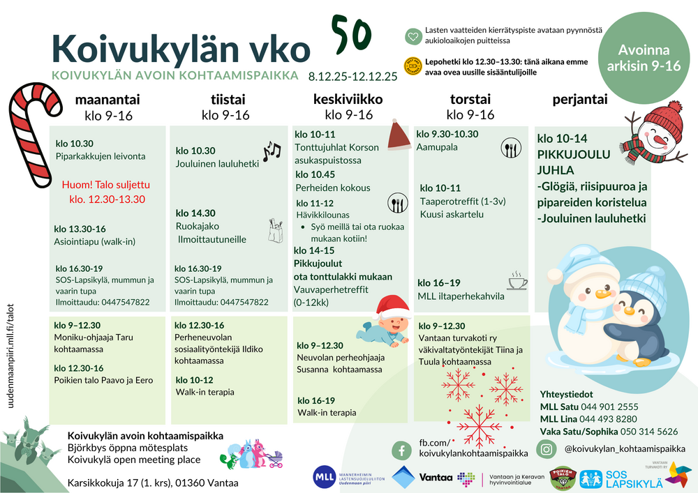 Huom! Lepohetki klo 12.30-13.30, jolloin emme avaa ovea uusille sisääntulijoille. Tulethan avoimelle toiminnalle ennen 12.30 tai 13.30 jälkeen.