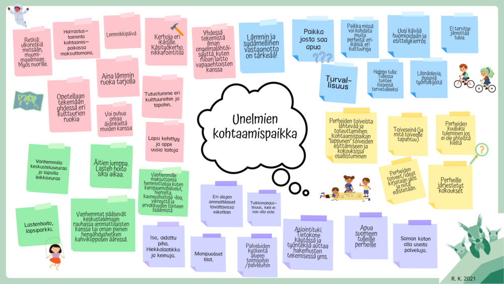Aamupäivän aikana osallistujat pohtivat pienryhmissä, millainen on unelmien kohtaamispaikka ja millaisia palveluita ja tukea toiminta mahdollistaa. Monet esiin nousseet asiat vahvistivat sitä, mitä perheet ovat nostaneet esiin aiemminkin kohtaamispaikan yhteisökokouksessa ja palautekyselyssä. Oleellista on lämmin tunnelma, yhteisöllisyys, helposti saatava tuki ja mielekäs toiminta niin lapselle kuin vanhemmalle.