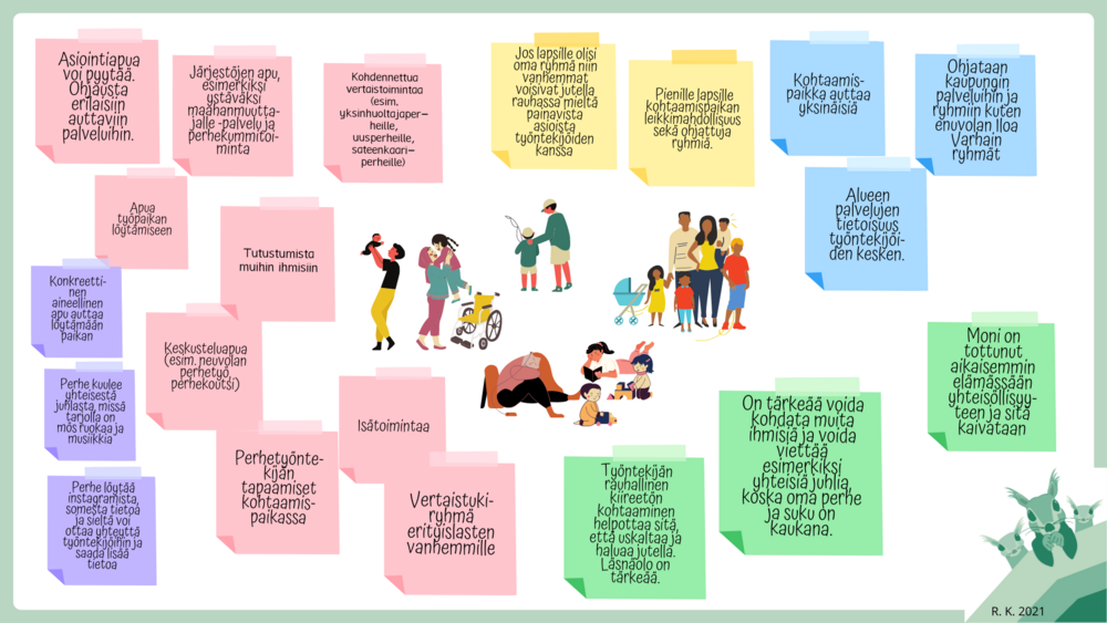 Ideoita tuli runsaasti ja perhekoutsit Mirkka ja Hanna tulevat viemään teemaa käytäntöön kohtaamispaikassa.