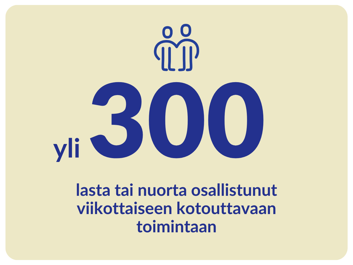 yli 300 lasta ja nuorta osallistui viikoittaiseen kotouttavaan ryhmätoimintaan ja lomatoimintoihin sekä retkille