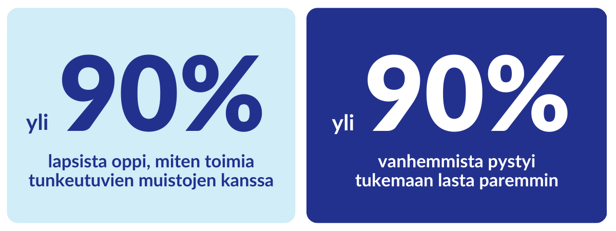 Traumaattisen stressin oireet vähenivät merkittävästi kolmen kuukauden seurannassa: lapsista yli 90 % tiesi, miten toimia tunkeutuvien muistojen kanssa, yli 80 % koki arjen ja oppimisen helpottuneen, yli 90% vanhemmista pystyi tukeman lasta paremmin.